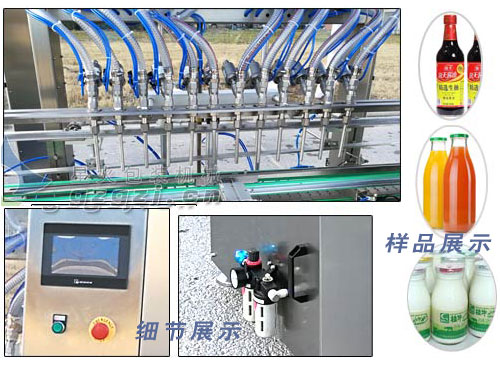 4、十二头直流式液体灌装机-羊奶玻璃瓶灌装机具有无瓶不灌装、自动进瓶出瓶、自动定位灌装、自动控制液位等功能,自动化程度高;灌装嘴设计科学合理,配防滴漏装置,确保灌装不滴漏,保证物料瓶及设备的干净卫生。